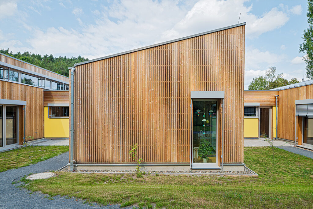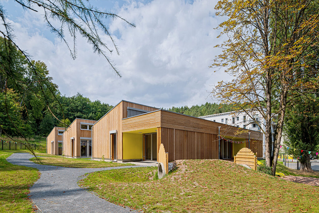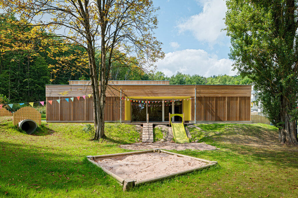 Im Coburger Stadtteil Wüstenahorn entstand eine neue Kindertagesstätte als Ersatz für einen bestehenden Containerbau. Der Entwurf reagiert auf die sensible Lage zwischen Wohnbebauung und Landschaftsraum in unmittelbarer Nähe zum Wolfgangsee.