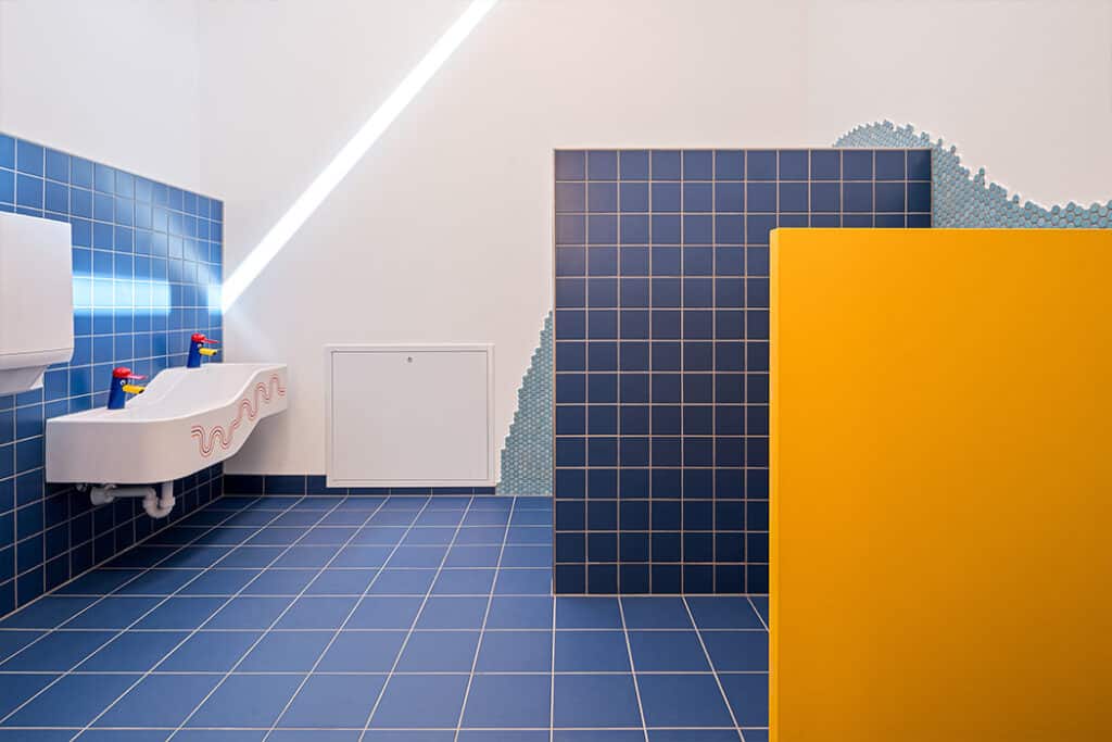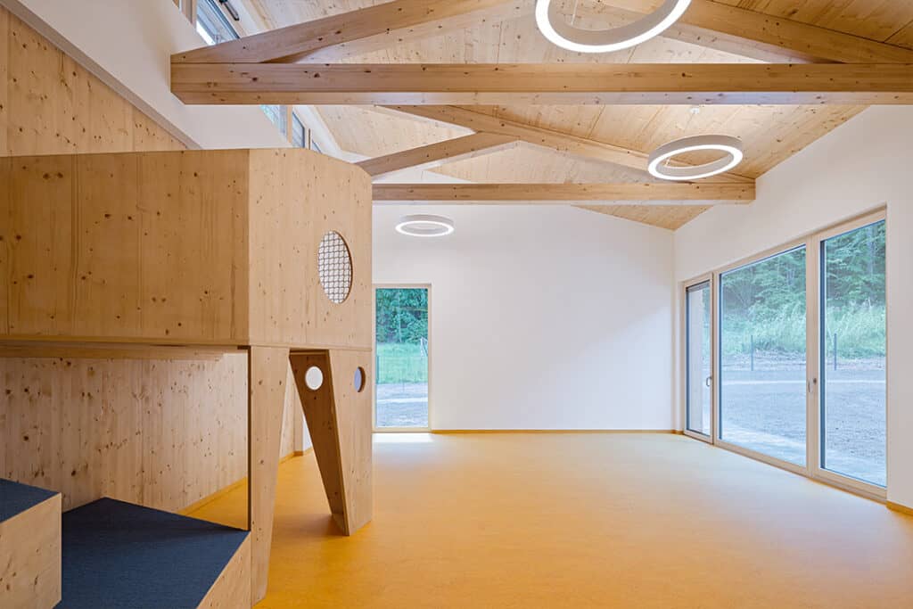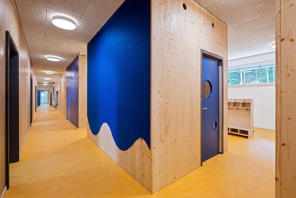 Der kompakte Holzbau orientiert sich entlang einer Ost-West-Achse und fügt sich behutsam in die bestehende Baumstruktur ein. Drei auskragende Gruppenräume – sogenannte „Finger“ – öffnen sich gezielt zur umgebenden Natur und schaffen vielfältige Ausblicke für die Kinder.