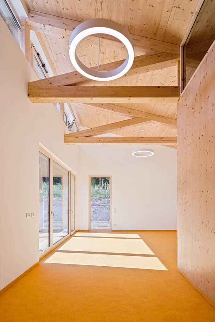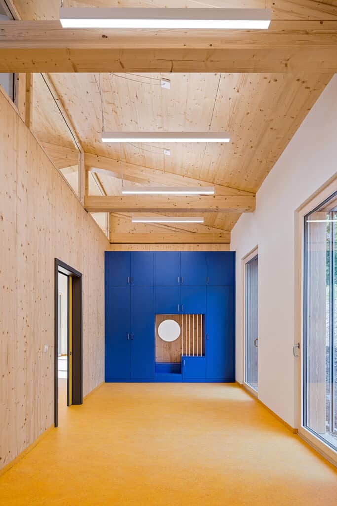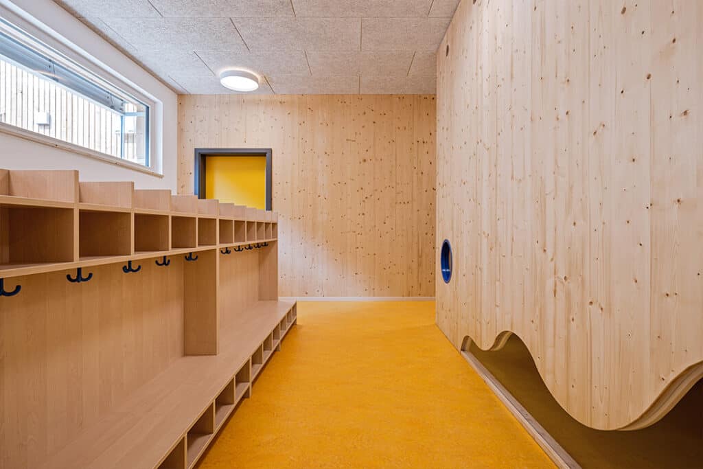 Die Konstruktion wurde in nachhaltiger Holzbauweise mit Brettsperrholzwänden und extensiv begrüntem Flachdach ausgeführt. Materialien wie Linoleum, Holz und farbige Akustikelemente sorgen für eine kindgerechte, warme Atmosphäre. Die unbehandelte Lärchenholzfassade mit farbiger Fassadenbahn unterstreicht den ökologischen Anspruch des Projekts.